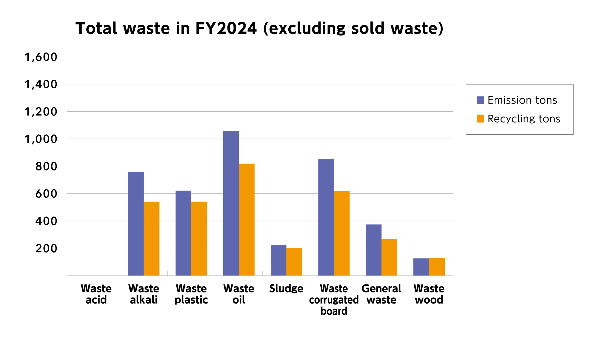 Identified the actual amount of waste liquid discarded in FY2024 in proportion to the level of production. Improved the management of waste liquid, so as to prevent environmental pollution due to spilled waste liquid.