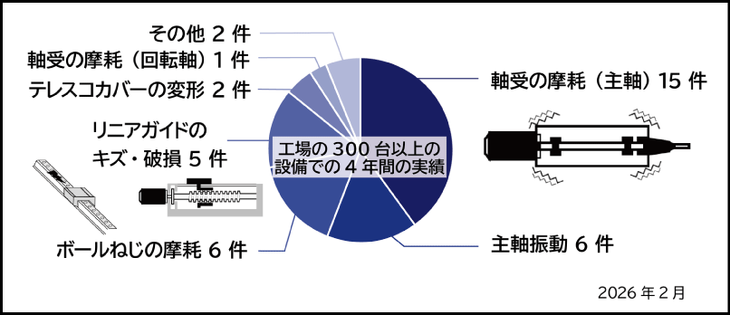 リニアガイドの破損、ボールねじの摩耗、主軸の振動・摩耗など重大な故障の予兆を早期に発見し、計画的な修理・交換へとつなげています。