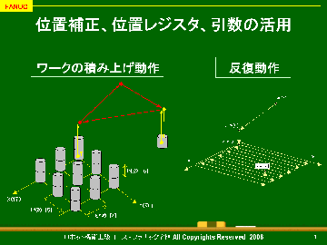 ファナックロボットのデータレジスタや位置レジスタ等の変数、位置補正機能、演算機能、引数等の機能を駆使することによって、ワークの積み上げ積み下ろし動作や、固定パターンの反復動作を行うプログラムを簡単に作成することができます。また、変数を変更することによって、類似したロボット動作に簡単に対応できるようになります。